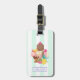 En personlig bagagetagg illustrerad med teckning på en 3-skopig glasgräddspark med färgstarka sprinkler. En glasskon med choklad, jordgubbar och vanilj. En skål neopolitan glass med körsbär på toppen. Jordgubbar och ananas frukt sitter bredvid skålarna. Summery och söt. En mynta grönt och vit rand mönster i bakgrunden.