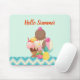 En muspekare med texten (kan ändras till namn eller spelar ingen roll) som lyder: Hej Summer. Illustrerad med en skål glass med 3 giftiga skopor täckta med godis sprinkles. En glasskon med 3 påsar choklad, vanilj och jordgubbar. En dessertskål fylld med neopolitan smaksatt glass med ett giftigt körsbär på toppen. En kräm och blå schevron mönster längs grund kant.