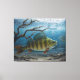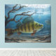 Beneath frozen water, a perch fish notices bait cast by someone ice fishing above.