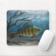 Beneath frozen water, a perch fish notices bait cast by someone ice fishing above.