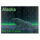 Ett fredligt ögonblick i den långa arktiska natten. Ett Polar Bear vilar vid kant i ett öppet utrymme i förpackningsisen. Norra Ljus glöden i avstånd; ljusstjärnorna skymmer. Texten som läser "Alaska" visas i ljusande grönt och vit. Anpassa genom att lägga till ytterligare text. Polarnas björnar är i fara. Hur mycket längre kommer sådana scener att kunna inträffa? Hjälp spara Polar Bears från utrotning.