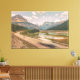 En scenisk Icefield Parkway Road i Banff National Park i Kanada, vind genom en dal, med en flod som snurrar genom landskapet. Vägen är kantad och har gult linjer i centrum. Ett vitt fordon är suddigt i rörelse, vilket tyder på hastighet. Bergarna i bakgrunden är stora och snö-täckta, med ett tydligt blå himmel ovan.