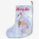 Kute rosa julflamingo med en andedräkt runt nacke och färglös bollar över isbakgrunden. Valfritt monogram