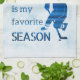 Blå personlig hockeyhandduk "Favoritsäsongen" - en underbarare gåva till flickhockeyspelare som är användbar med tanke på att det är viktigt att torka ut bladen efter träning.Färg: Mörk blått linjer om blå isbakgrund.Design: "Hockey är min favoritsäsong" + hockeyspelare silhouette + personifiera med namn i hockey älskare.