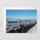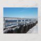 De sceniska visningarna frostigt vita, vind blåst, frysta självhäftande. De är på väg från en metall-järnväg och ett skott. Snö kan ses framför skottet. Blåan vatten i bukten tillsammans med blå himmel kan ses i bakgrunden. Detta landskapsfoto togs i norra änden av Long Beach Island i Barnegat Light, New jersey.