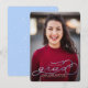 Din examen kommer att lysa på detta examensbevis med ett foto. Det har ett foto som sträcker sig till kanterna med lätt blå falsk folie-stilskrift över det. Namnet på den som tagit examen, år och skolans namn är alla redigerbara.