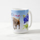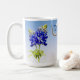Unik mugg-design med Blånätsblommor från Texas och Texas Longhorn på ljusblå blått. Blåblomman är Texas statsblomma. I mars och april blommar dessa vackra blommor i fält och på fribanans medianer.