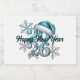 Celebrate the arrival of 2026 with this dazzling winter-themed design featuring shimmering icy blue and silver numbers. A teal Santa hat tops the “0,” a silver bow adorns the “2,” and sparkling snowflakes dance around the scene. Centered in elegant script, “Happy New Year” adds warmth and cheer to this festive black-background layout—perfect for seasonal greetings, party invitations, or holiday decor.