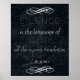 Rumi citerar: Tystnad är Guds språk, allt annat är dålig översättning. Skrivs på en svart marmorerad sten struktur. Vit snurrande blomstrar överst och grund i citatet. finare och elegant stil.