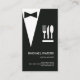 En enkel svart smoking på en idérik servitördesign som har att äta utensils i den fick- bröstkorgen. Nära basera av kortet är ditt prestigefulla namn, jobbtitel, och kontakten specificerar.