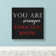 Påminn dig själv eller en älskad "Du är starkare än du vet" med detta djärva motiverade kanvastryck. Håll den på väggen där du inte kan missa den. Visning det åt andra att se. Håll dig motiverad. Håll dig stark. Gå med revolutionen. Bli inspirerad. Var en inspiration. Följ Revolutionens blogg på www.revoinspire.wordpress.com.