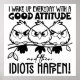 A humorous and sarcastic black-and-white graphic design showcases three bird silhouettes perched on a branch, each with big, expressive eyes. The black handwritten text reads, "I wake up every day with a good attitude and then idiots happen." This design is available on a variety of products, making it a perfect gift for bird lovers and fans of sarcastic humor.
