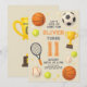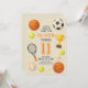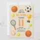 Ta med energin från matchen till ditt barns firande med denna livfulla idrottsdesign med bollar, troféer och racketer. Baksidan förvandlas till en lekfullt målarsida!