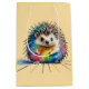 Ein freundlicher Igel in bunten Farben, eine kindliche Zeichnung eines Igels, mit Tusche und Kreide, gekleckst und geschmierte ist die Farben als Stil und Effekt des lustigen Bildes.