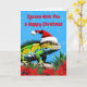 Iguana önskar dig en Lycklig-jul, söt julbild med en iguana som bär en julhatt och klamrar sig fast vid gren. Anpassa omslaget och insida-textområdena efter eget önskemål. Tonade arter, poinsetter och tropisk löv i guld ingår. Art, image och verse copyright Shoaff Ballanger Studios, 2023.