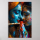 En andningsbild av Radha och Krishna i en serenmiljö, pastoral, omgiven av levande flora och fauna. Krishna, som spelar sin elakande flute, utstrålar lugn, medan Radha, med sitt vackra uttryck, förkroppsligar hängivenhet och kärlek