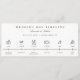 Modern minimalist, bröllopsdag-ikoner, tidslinjeprogram. Funktioner, ringar, cocktail, brud & groom, middagsinställning, musikanteckning och konfektykoner. Linjer för malltext om du vill anpassa tider och titlar för varje ikon.