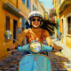 “Il riso del vento” (Laughter of the Wind). Playful, radiant, and utterly alive — she becomes one with the rushing air. The wind doesn’t resist her; it carries her, tangling joy through her hair and across cobblestones on her blue scooter. A joyful visual sonnet to freedom and feminine energy, echoing the poetry of sunlit motion.