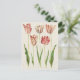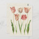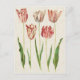 vykort med vintage som illustrerar rött, rosa och vita tuliper från The Gottofer Codex, 1649-1659. Digitalt rengjort och förbättrat för att likna en vattenfärg på en ljusartad struktur-motorik bakgrund.