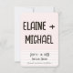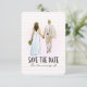 En enkel, modern design för att spara datum. Framsidan har en illustration av en brud och en brudgum som går hand i hand tillsammans med en 'spara datum'-annons. Baksidan av designen följer färgtemat rosa, brunt och vitt. Den har brudens och brudgummens namn i stora, feta bokstäver högst upp. Och längst ner följer datum och platsinformation.