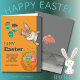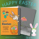 Cute Glad påsk Illustration , som är målad för hand och som har Påskharns hakande huvud vid dörren, ett sött målat Påskägg som hänger från taket och ett annat i basket vid golv. Det huvudsakliga färg-systemet är grått och ljusa orangar för bakgrunden med beröring av andra ljusa färger på äggen och grått-texten. Uppdatera enkelt all text som du vill ha. Kortets baksida har grått-bakgrund med en blomma. Glad påsk!