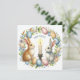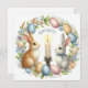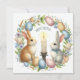 Bilden skildrar en vackert designad Påsk-tematisk illustration. Den har två bunnier sitta mot varandra, med ett tänt ljus i mitten. Klinierna omges av en cirkulär arrangemang av Påskägg, blommor och bladverk av pastelltyp, färgad och grönt. Ovanför ljussken är texten "Glad påsk" skriven i ett böjt stil.