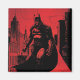 Tecknad bok stil illustrerar Batman som står vid en gargoyle i Gotham City.