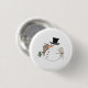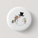 Illustration av en tecknad stil jul snögubbe på en snö-scen med snö täckta hus och träd i bakgrunden.