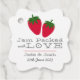 Ett par söta, illustrerade jordgubbar pryder denna dusch- eller bröllopssylt-förmånsetikett med anpassad text och ett matchande mönster av jordgubbar på baksidan.