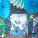 Tydligt illustrerade vattenfärgsvita måne-blommor, fåglar och löv av blå grönt. Denna moderna stationära och party-utformning är perfekt för alla utomhusmiljöer firande i en sommarträdgård som för bröllop.
