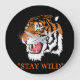 "En fantastisk väggklocka med en kraftfull ilska tiger med den djärva texten 'Stanna Vild'. Perfekt för heminredning, kontor eller som en present till vilda djur älskare. Högkvalitativt tryck och unik design."