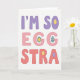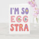 This card features a big typographic design that reads “I’M SO EGG STRA,” centered on a white background with rounded letters in soft lavender, light pink, and warm coral. The words are stacked in a neat layout, with “I’M” smaller at the top, “SO” beneath it, and “EGG STRA” taking up most of the space in the middle, giving the phrase a friendly, close-together feel like an inside joke between two people 🌷. Each letter has a slightly raised, cushion-like look created with gentle shading, adding a cozy, affectionate tone without needing any characters. The text color shifts across the phrase, keeping the eye moving from line to line while still staying easy to read. Decorative egg shapes are tucked inside select letters, echoing the pun and adding a sweet, flirty touch 🐰. The “O” in “SO” and one “R” in “STRA” contain bright yellow ovals with thin white wavy lines, like little shared surprises hidden in the message. Two “G” letters in “EGG” are filled with teal ovals—one with a small yellow burst-like motif and one with white wavy lines—while the final “A” holds a lavender oval with matching white waves.