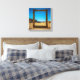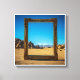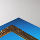 A striking, high-contrast image featuring a large, ornate golden frame standing in a vast, arid desert or rocky plain. The frame perfectly captures a segment of the bright, cloudless deep blue sky and the rugged landscape beyond. Inside the frame, distant, snow-capped mountains rise behind jagged rock formations and sandy terrain. Outside the frame, similar golden-brown rock formations flank the sides, reinforcing the sense of framing a natural, majestic view. The intense sunlight creates deep shadows and highlights the rich texture of the gilded frame and the dry, cracked earth.