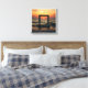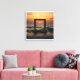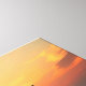 A dramatic and surreal image captures a wooden picture frame standing upright amidst turbulent ocean waves during a vibrant sunset. The frame perfectly encircles the bright orange sun descending towards the horizon, making the sun the focused centerpiece within the border. Dark, frothy waves crash around the frame's base, contrasting sharply with the warm, fiery hues of the sky and the glowing sun. The overall effect is a striking juxtaposition of art, nature, and raw power.