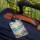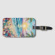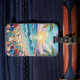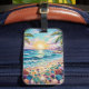 Pretty seaside coastal luggage tag with a gorgeous ai impasto oil painting style illustration of blue ocean waves crashing on a sandy beach, that is covered in sea glass and surrounded by palm trees at sunset and sunrise.