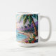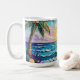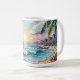 Pretty seaside coastal coffee cup with a gorgeous ai impasto oil painting style illustration of blue ocean waves crashing on a sandy beach, that is covered in sea glass and surrounded by palm trees at sunset and sunrise.
