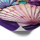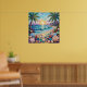 Pretty seaside coastal poster with a gorgeous ai impasto oil painting style illustration of blue ocean waves crashing on a sandy beach, that is covered in sea glass and surrounded by palm trees at sunset and sunrise.