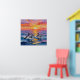 An ai impasto style dolphins swimming with a pink, orange and purple sunset over the ocean . A beautiful coastal poster wall art piece for your beach home or beachy styled home.