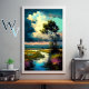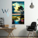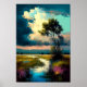 Det målade landskapet i sjö med moln med träd och blommor, stil i mättat färg fält, med uttryckligt ljus och skugga, mörkens cyan och gult.