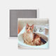 Magnet med mitt originalfoto, ändrat digitalt så att det ser ut som en imponerande målning av kattunge sitta i ett sjunkbäcken. Katten är mestadels vit med bruna, orange och svarta markeringar. Hon har en ljus rosa näsa och ett stort blått ögon. Hennes uttryck verkar säga: "Var är bubblorna?" Sänkan är vit med gammaldags kromfixturer. En skarp persikohandduk som nästan matchar orangens markeringar på kattunge hänger nära. Bildens kant har ett mjukt, oavslutat utseende. Säkert att slicka hjärtat på vilken kattälskare som helst. Den här designen fungerar bra både på fyrkanten och på runda magneter.