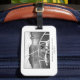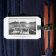 Bagagetagg med en svart och vit bild av en fiskebåt som kommer in i Kap Town-hamnen från Bord-bukten med tanke på Bord-berget.