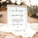 Den här In Loving Memory Sign har en minimal elegans till din bröllop eller speciella händelse för att hedra dem som verkligen missas. Redigera enkelt de flesta formuleringar så att de stämmer överens med stil. Färg för text och bakgrund är helt redigerbart —> Klicka på knappen Anpassa ytterligare för att redigera!