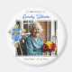 Ett minnesmärke i form av en magnet med foto för begravningar, firande av livets högtider eller för att skicka till vänner och familj för att hedra någon de har förlorat. Du kan lägga till ett foto i det personliga området. De accentfärger som används är blå och guld. Det finns ett guldkors med blå blommor på det.