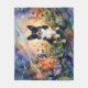 This image features a black-headed tri-colored corgi amidst a vibrant field of flowers. The artwork is rendered in a fluid alcohol ink style, creating a unique visual effect.