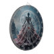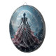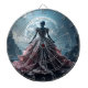 A mysterious figure in an elaborate gown stands before a glowing full moon, set against a dramatic rocky landscape. The scene is enhanced by the contrast between the intricate details of the dress and the rugged terrain.