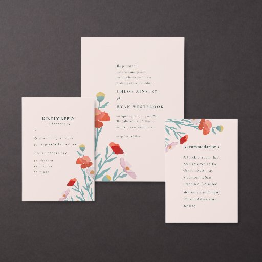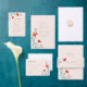 Den här bröllopsinbjudan innehåller handmålade vilda blommor, vilket ger en liten bit naturlig elegans till en enkel men sofistikerad design.