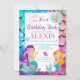 Den här födelsedagsfesten med söta Sjöjungfruar är perfekt för ditt barns kommande simmande party eller till och med bara en magisk Sjöjungfru Party. Tvätta sjöjungfruar med bubblor och snäckor tillsammans med några få små adjektiva sjöjungfruar. All personlig information kan redigeras. Baksidan har också en stranddesign med sjöjungfru- och skattkista. Du kan också lägga instruktioner eller mer information på baksidan.