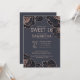 Modern, elegant och chic faux skriver ut ro guld och svarta skisserade blommor på marinblått, Sweet 16-födelsedagskalbjudanden. Den här klassiska och sofistikerade designen är perfekt för klasser, trendig och snyggtar. Anpassa med ditt eget meddelande på framsidan och ett anpassat inledande monogram på baksidan. All fotoutskriftsdesign.