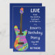 En ljusstark färgad elgitarr är höjdpunkten på denna roligt inbjudan att se ut som en konsertposter. Guitarren är fylld med briljanta nyanser av rosa, gult, orange, grönt, lila och blått. Bakgrunden på kortets framsida och baksida är en djup övertoningsblå. anpassadet på inbjudan kan enkelt ändras till kostym som du själv behöver. Från min ursprungliga digitalt skapat bild.