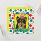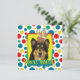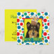 Inbjudan era gästerna med det här visuella Hund- hälsningskortet. Med en kaka som är balanserad på huvudet är den här designen säkert en leende och gigglar! BTW, den här designen har flera versioner, med olika färger i bakgrunden. Det finns också en version av Grattis på födelsedagen.